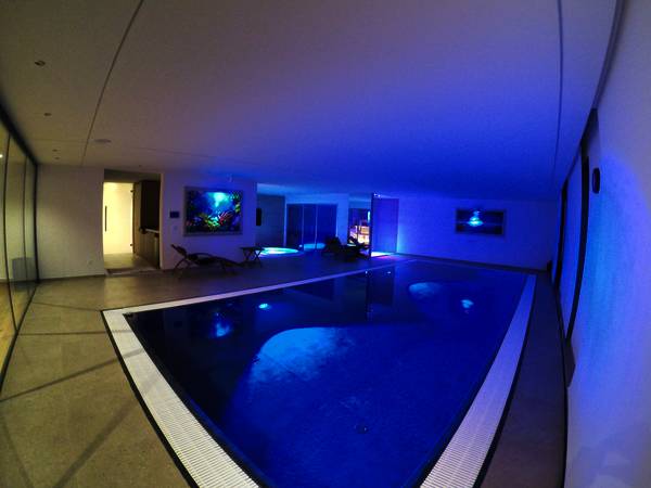 Al piano inferiore la superficie è così disposta: disimpegno, due camere, bagno, uno spazio dedicato all’area cinema, una bella SPA, con piscina, sauna, bagno turco e Jacuzzi, e una bella sala fitness con spogliatoio e bagno. Locali tecnici, e di servizio alla villa sono disposti su questo piano.